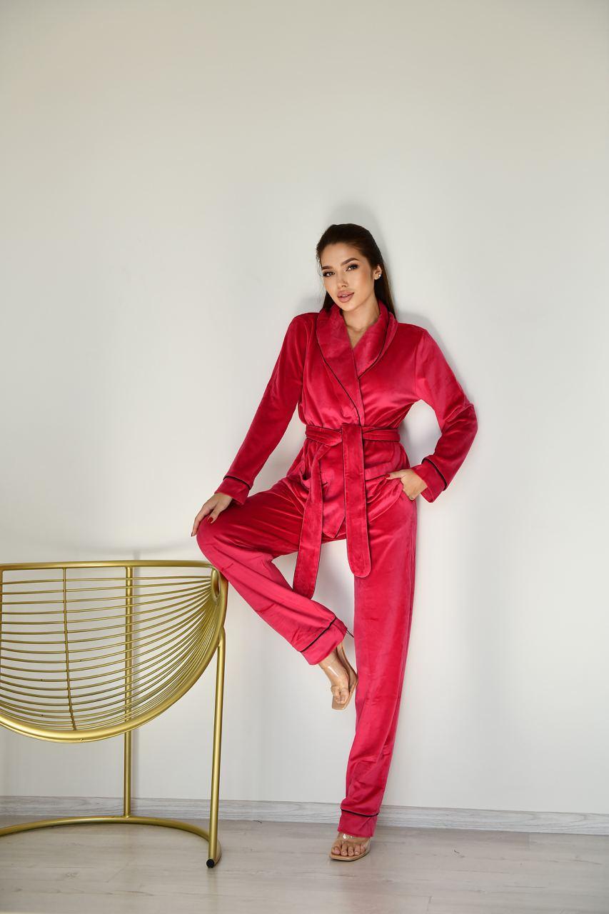 Тепла зимова велюрова плюшева жіноча піжама на запах із штанами домашній костюм колір малиновий